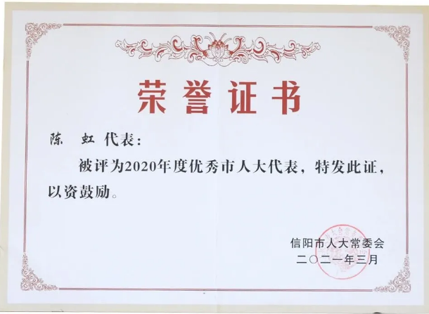 本次会议上,陈虹被评为“2020年度市优秀人大代表”,充分体现了信阳市人大对她工作的认可和肯定。
